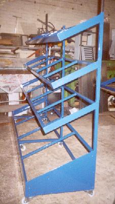 This is a shop produce display unit. It has angled shelves so as to enable maximum product visibility. Finished of in blue to match