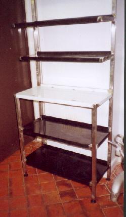 Stainless table with 2 tiers. This design takes up a small space, but is able to store alot, as well as being a prep