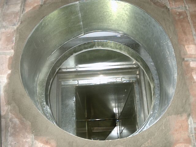 vibration coupling which will connect below the fan. This will eliminate any vibrations that may travel through the building. It is a flexible connection. Below is the ouside view of the above picture as it exits. |